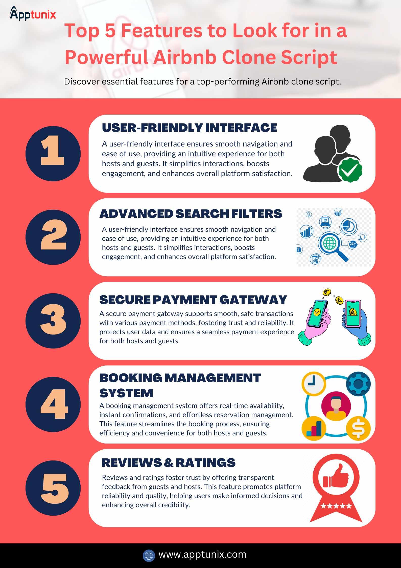 Explore the top 5 features for a powerful Airbnb clone script user-friendly interface, advanced search filters, secure payment gateway, booking management system, and reviews & ratings to enhance user experience and trust.
